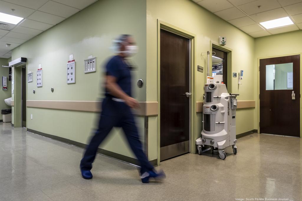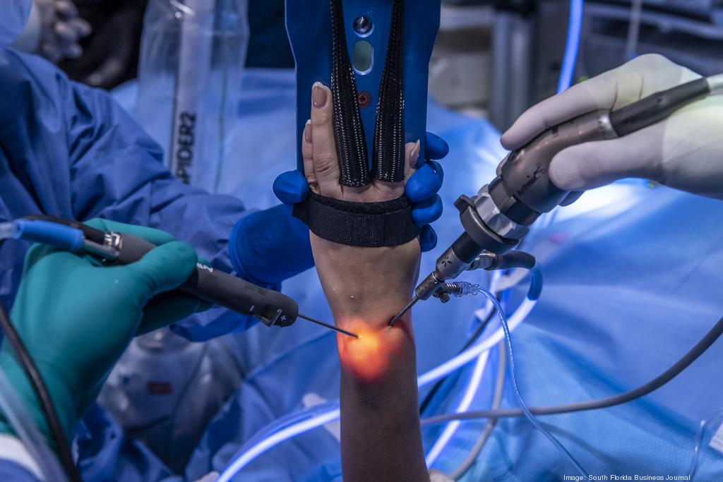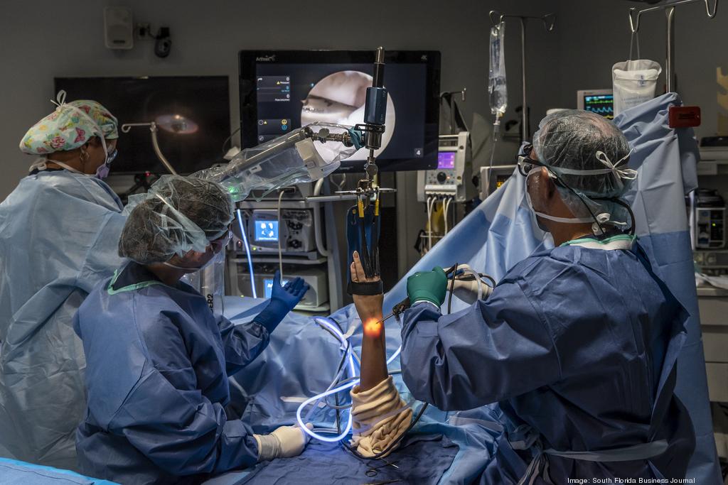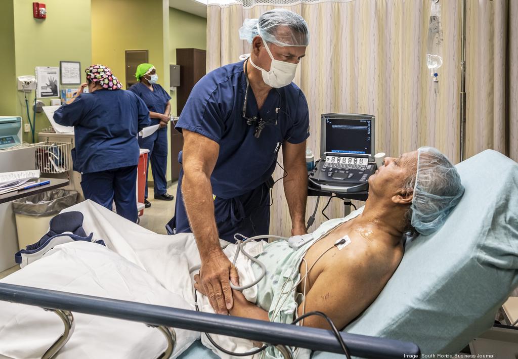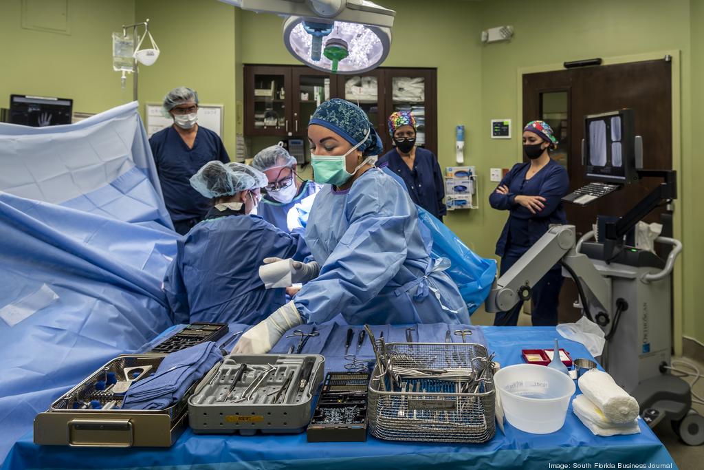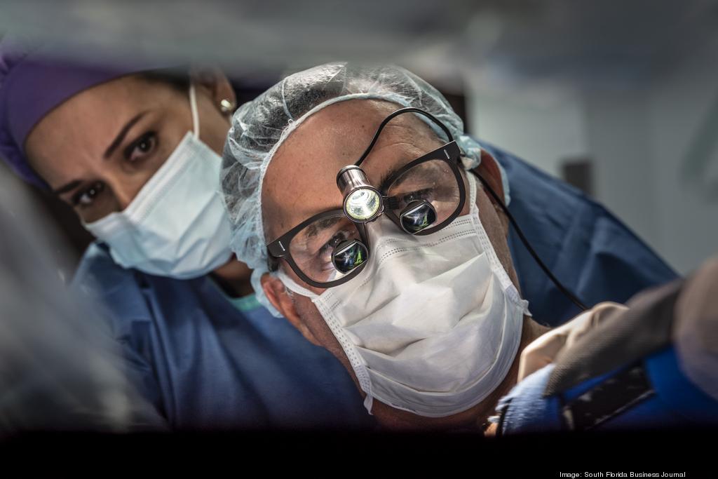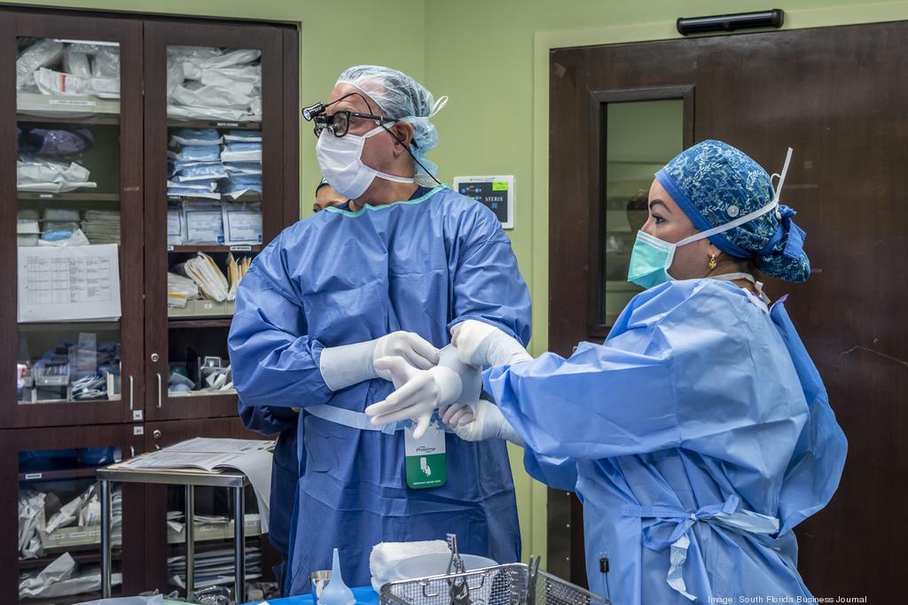 Starting at 7:30am, Dr. Alejandro Badia, masks up before speaking with one of his first patients of the day. In an effort to be efficient with his time and keep surgical costs down for his patients, Dr. Badia, runs three operating rooms simultaneously, moving from one OR to another. Badia said he will average around 14 hand surgeries a day when he has a full surgical schedule.