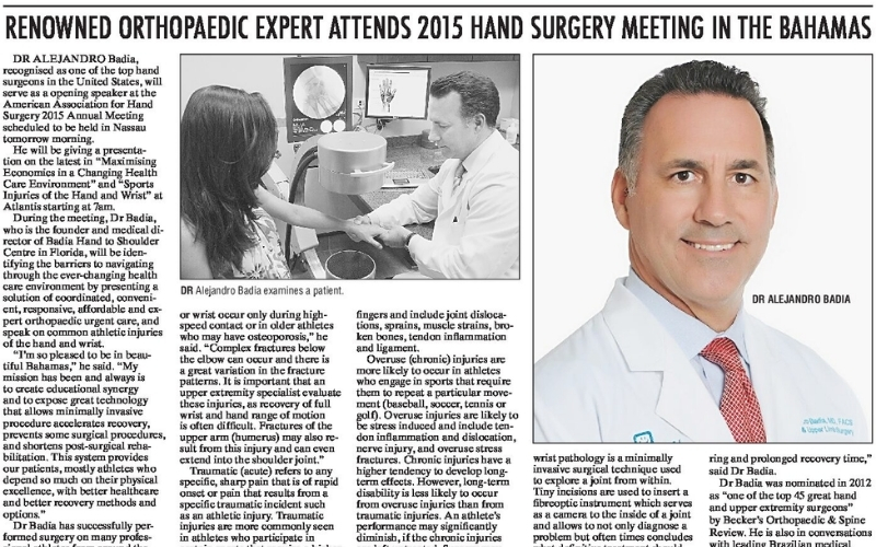 Explore las últimas noticias, entrevistas y artículos del Dr. Alejandro Badia. Descubra información sobre tratamientos avanzados para condiciones relevantes para nuestros pacientes de las Bahamas, como lesiones de muñeca atléticas y el síndrome del túnel cubital, y vea cómo su pericia está logrando un impacto global.