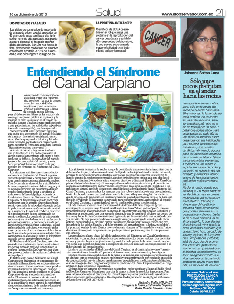 Si tiene dolor en las manos, no renuncie a su empleo, mejor decídase y llame al Badia Hand to Shoulder Center en Miami para una cita: le vamos a librar de ese dolor innecesario. Para más información sobre el Síndrome del Canal Carpiano y otros problemas en las extremidades superiores visite la página web del Dr. Alejandro Badia por medio de su página web www.drbadia.com/es o llame al teléfono 305-227-4263.