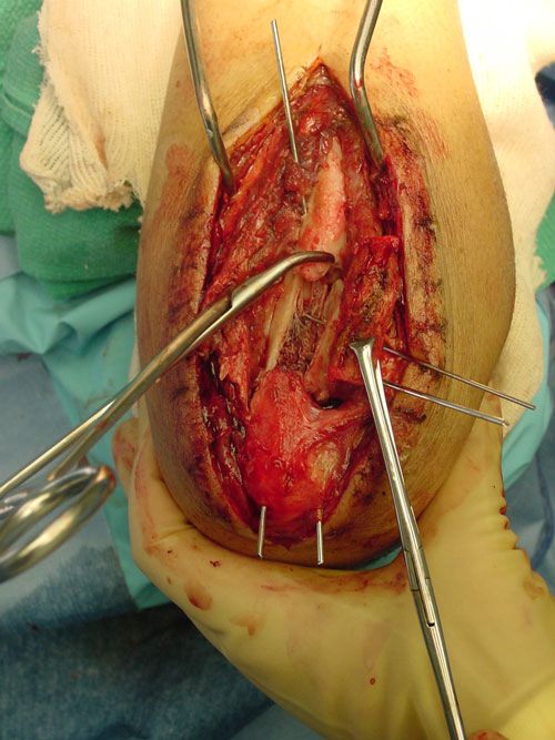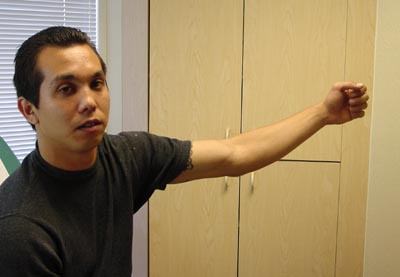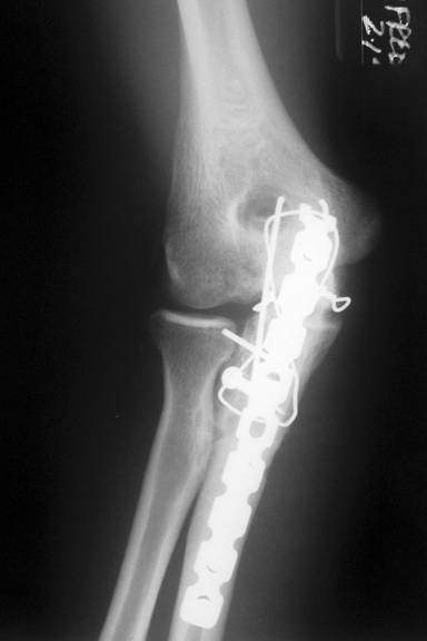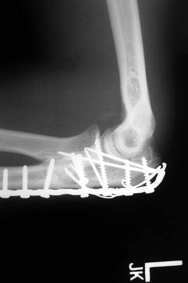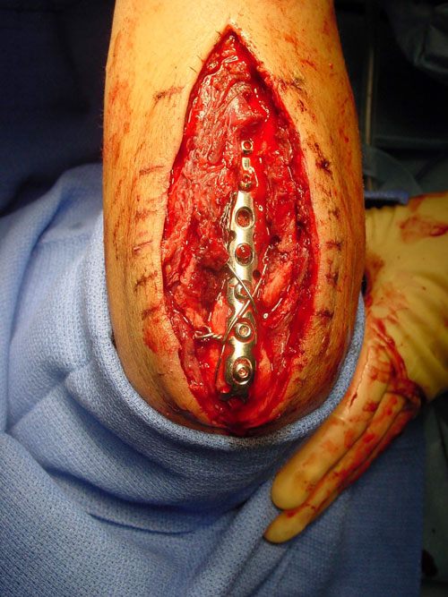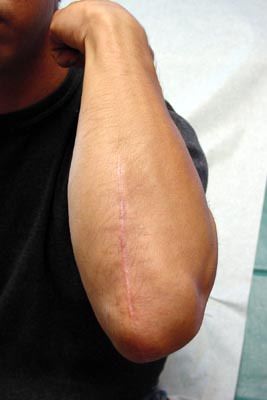 AC is a 25 year old male who was assaulted with a baseball bat. He sustained a shattered proximal ulna fracture with elbow dislocation. Surgery required application of a plate and screws, as well as pinning and cerclage wiring. He worked diligently in therapy to regain the excellent range of motion in his elbow as demonstrated in the photo with me.