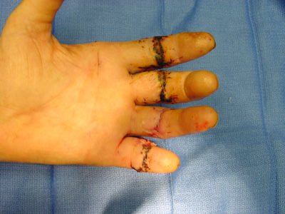 JJ is a delightful and vigorous 73 year old retired man whose favorite hobby is making Westminster chimes clocks for his grandchildren. One ordinary day when he was using a circular saw to cut the molding for another clock, he sustained a devastating injury. He amputated the four fingers of his left hand and was brought to the local emergency room in a small town on the west coast of Florida. His ER doctor astutely sent his wife back to recover two of the fingers from the workshop floor while he searched the state for a hand surgeon who would accept this challenging case. Not only was this essentially a four finger amputation, but it occurred in an elderly man with a history of a cardiac stent procedure.